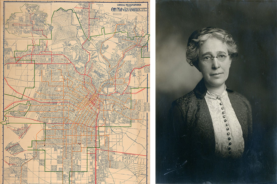 Left: Detail of Official Transportation and City Map of Los Angeles, 1919. The Huntington Library, Art Collections, and Botanical Gardens. Right: Laura L. Whitlock. Unknown date and photographer. Security Pacific National Bank Collection/Los Angeles Public Library.