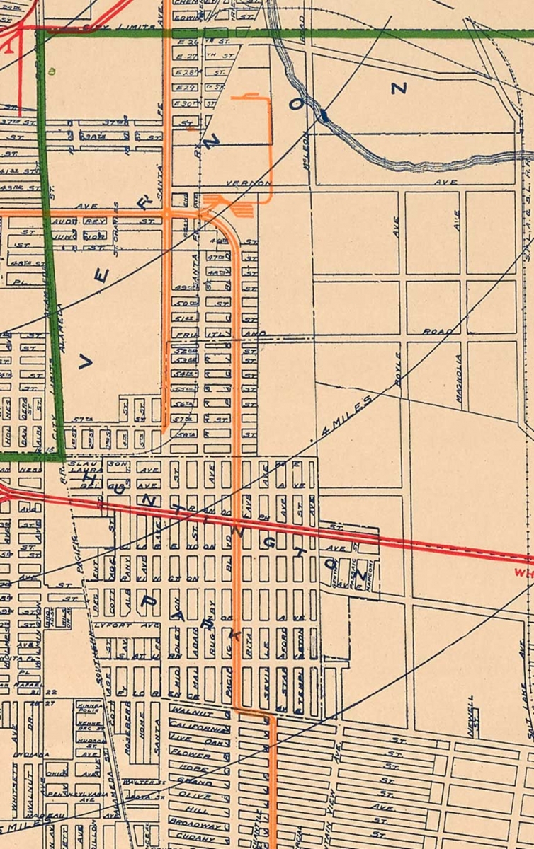 The cities of Vernon and Huntington Park were also key parts of the greater L.A. area that Whitlock included in her map, despite technically existing beyond the green city-limit line. In this less-dense corner of the plan, we can see the distances from downtown Los Angeles on Whitlock’s one-mile radial rings.