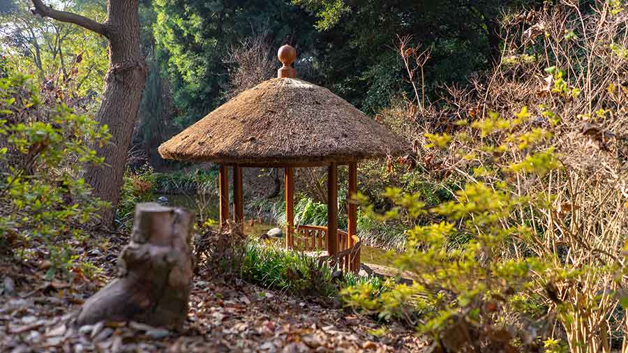 The pavilion was capped with a thatched roof by Chinese artisans during the construction of the Chinese Garden more than a decade ago; the concept with this structure was to show what very early Chinese garden pavilions looked like during the Ming Dynasty, distinct from the far more sophisticated-looking pavilions with ornate tile roofs that swoop and curve at impossible angles. But because of the burrowing of animals and the moldering of leaves in the intervening years, the roof had become “a little scruffy,” according to Andrew Mitchell, the gardens curator for material objects at The Huntington. With the expanded Chinese Garden set to open in the spring, “We wanted the pavilion to look fresh and renewed,” he said.