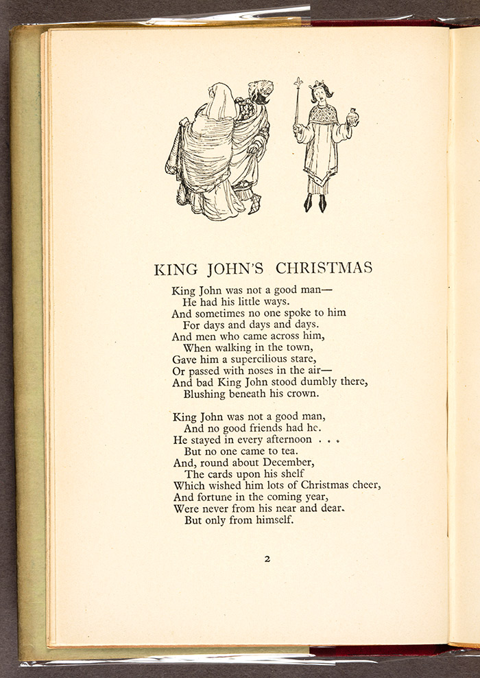 The first page of A.A. Milne’s “King John’s Christmas” as printed in Now We Are Six, first edition, London, 1927. The Huntington Library, Art Collections, and Botanical Gardens.