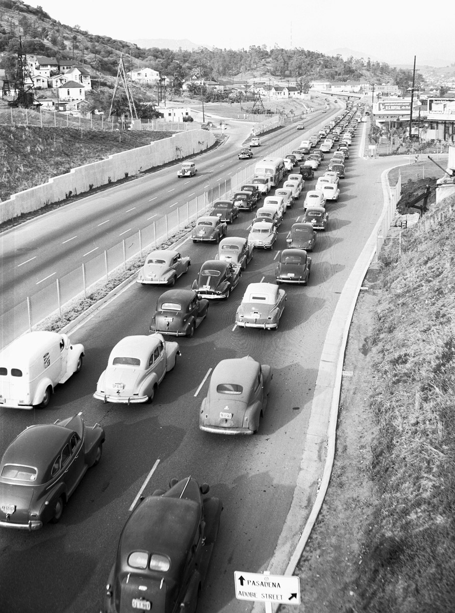 Arroyo Seco Parkway, 1948, northbound traffic at 5:00 p.m. Courtesy Automobile Club of Southern California Archives.