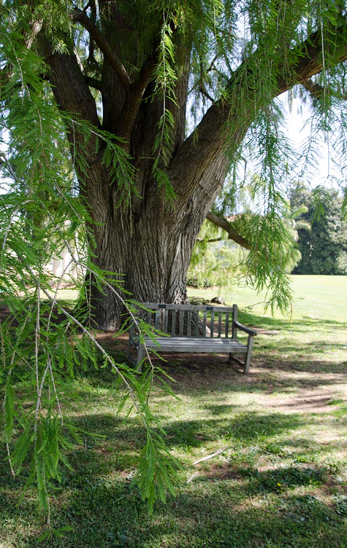 Two stand-outs at the top of Thibault's list are the ombú tree (Phytolacca dioica) by the Lily Ponds—an Argentinean native with a thick, water storing trunk—and the Montezuma cypress (Taxodium mucronatum) in the Rose Garden, a Mexican beauty known for its lacy foliage and gracefully weeping boughs. "Both trace their roots to 1912, just after the house was built and before the Huntingtons settled in," he explains. "The Phytolacca shows the early collaboration with the USDA on plant exploration and importation. The seeds came from the botanic garden in Buenos Aires. The Taxodium represents early fieldwork by William Hertrich, Huntington's superintendent. He collected the seeds himself in Chapultepec Park in Mexico City." Additional specimens of the Montezuma cypress can be seen below the Lily Ponds, where welcoming benches make them a favorite resting place.