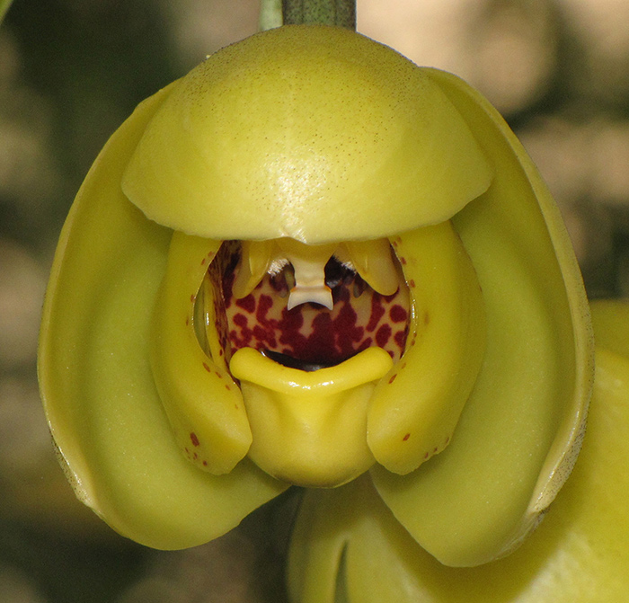 In contrast, a specialized effort involves seeking a measure of diversity within some number of these groups. Examples of this approach would be the genera Paphiopedilum, Acineta, and Lepanthes in our case. These more narrowly themed collections allow us to exhibit the evolution of orchids where similarities are readily discernible. Such simultaneous specialized and generalized collecting is common to other areas of The Huntington’s living plant collections as well.