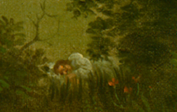 But the more I showed the picture as light relief from hard-hat economic history, the more questions I received about the painting itself and the more curious I became about it. Who were the gentry family in the foreground? Why does the landlord have a telescope on his desk which appears to be directed at the labor force? Why are so few of the laborers actually working? In fact, only one of the eight immediately visible figures can be said to be engaging in unremitting toil. The others are bantering, drinking (or restraining their fellow from drinking) or defiantly staring at their patrician landlords, rake raised away from the grass and hand coquettishly on hip (see Detail 1). Close study revealed the presence of a ninth figure, almost certainly a single male (though he may just possibly be accompanied by a partner!) lying recumbent and quite possibly asleep under the hedgerow at the very center of the painting (see Detail 2).