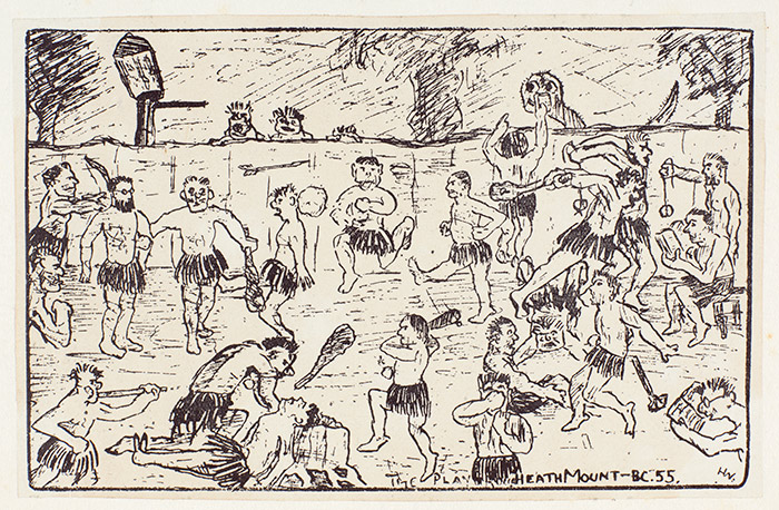 Naomi Milthorpe, a presenter at the Waugh conference, has been studying Waugh’s juvenilia at The Huntington, including “Heath Mount BC 55,” a humorous depiction of Heath Mount School in Hampstead, England, as it might have appeared in ancient times. Waugh attended the school from the age of 10 to 14. Illustration by Waugh and Hooper, 1916, Evelyn Waugh Papers. The Huntington Library, Art Collections, and Botanical Gardens.
