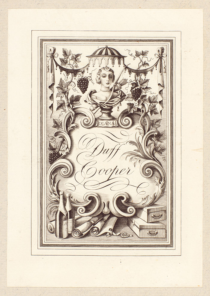 Duff Cooper bookplate pasted inside the autograph draft of Waugh’s travelogue Ninety-Two Days, Evelyn Waugh Papers. The Huntington Library, Art Collections, and Botanical Gardens.
