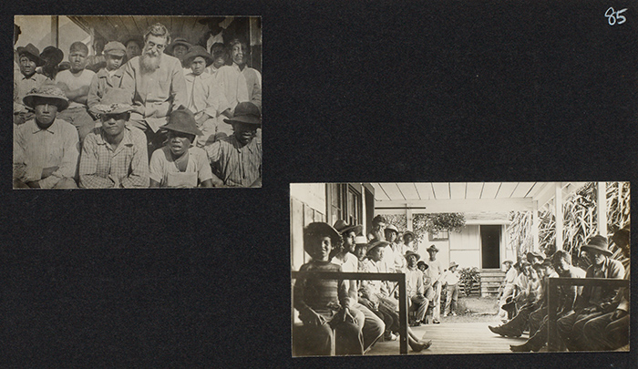 Two images of Joseph Dutton on Molokai, ca. 1905. In the image on the left, Dutton sits with a group of Hawaiian men and boys. In the image on the right, Dutton is seen with a group of men on a porch of what may be the Baldwin Home for men and boys that Dutton founded on Molokai. Two images of Joseph Dutton on Molokai, ca. 1905. In the image on the left, Dutton sits with a group of Hawaiian men and boys. In the image on the right, Dutton is seen with a group of men on a porch of what may be the Baldwin Home for men and boys that Dutton founded on Molokai.