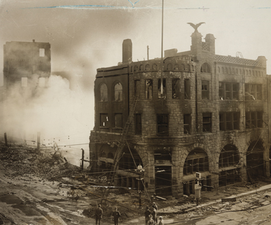 The smoldering ruins of the Times building, morning of Oct. 1, 1910, after bombing by union organizers.
