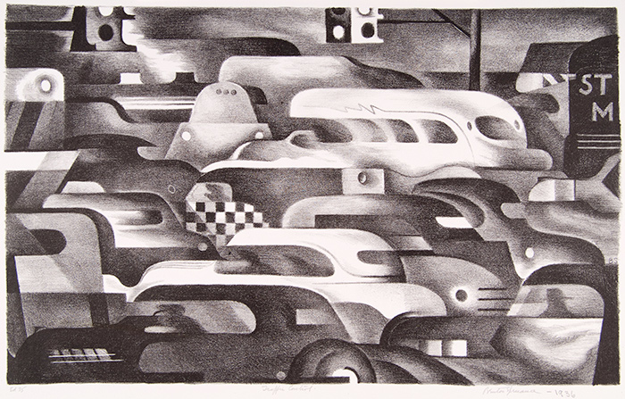 Benton Murdoch Spruance, Traffic Control, 1936, lithograph on woven paper, 9 × 14 3/8 in. The Huntington Library, Art Collections, and Botanical Gardens. Purchased with funds provided by Russel I. and Hannah S. Kully. Image courtesy of bentonspruance.com.