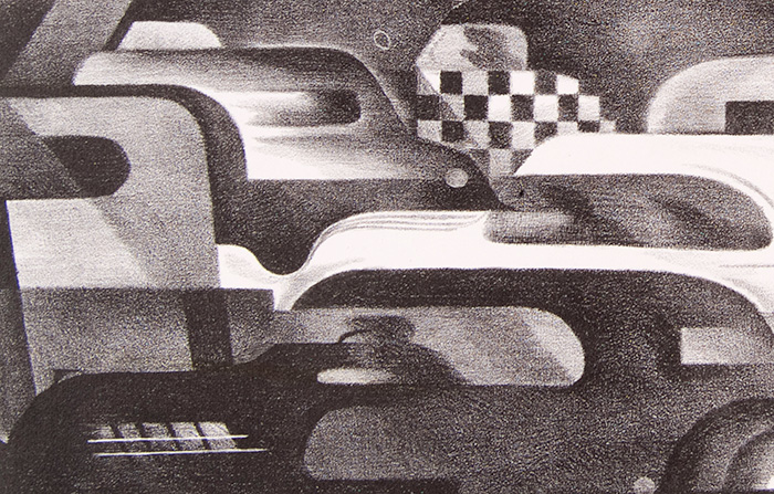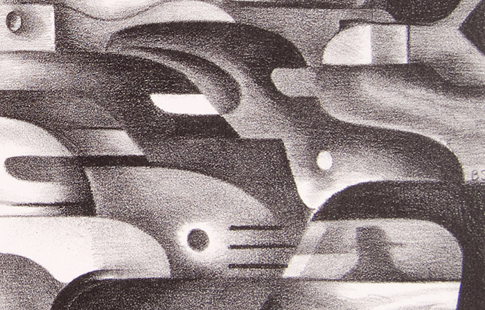 At first glance, the cars’ irregular rhythms feel static. They’re stuck waiting for a light to change or an impediment to be removed. However, if you keep looking, they start sliding around each other, darting this way and that. Nothing really moves—this is a lithograph, not a motion picture—but the artist gets at that peculiar way congested traffic seems to be frozen, even as cars trundle imperceptibly forward, nerves fray, and patience wears thin. Put another way, Spruance’s cars are standing still and still moving. I wonder if he ever lived in Los Angeles?