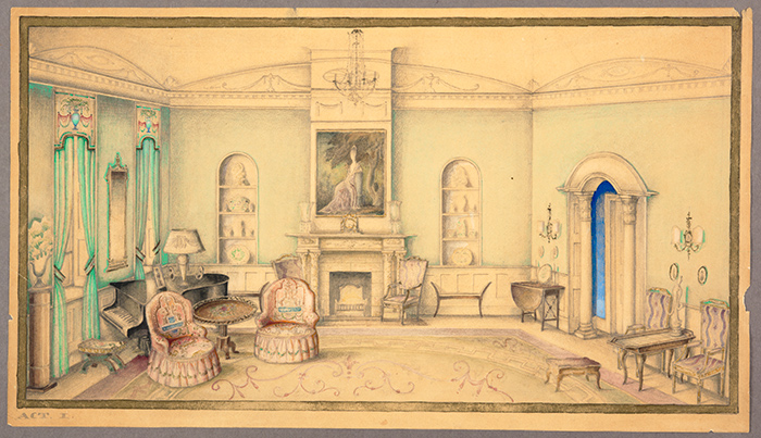 The highlight of The Huntington’s Nielsen holdings is a set of watercolor illustrations for stage sets, produced in preparation for Akins’ stage adaptation of W. Somerset Maugham’s 1930 short story The Human Element. Charting the foibles of the human heart, The Human Element tells the tale of a socialite (the daughter of an English duke) and her admirers, and reveals a secret love between the daughter and a household servant.