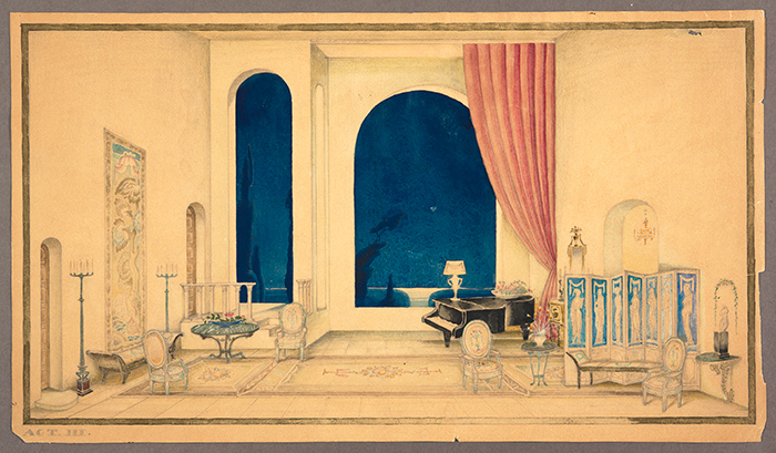 Nielsen’s watercolors possess a dreamy quality, evoking both resplendence and intimacy. The first act takes place in the duke’s house in London. Nielsen’s treatment of the scene shows finely wrought detail and delicate hues that suffuse the furnishings and décor with soft afternoon light. From correspondence in the collection, we know that Nielsen and Akins worked closely to match the arrangement of the furniture to the action.