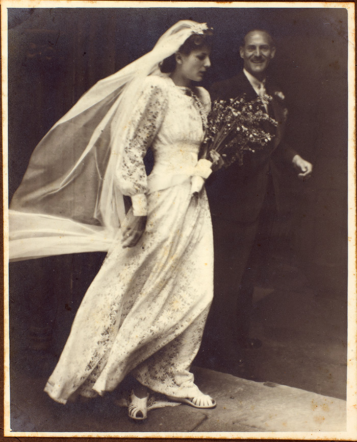 Elizabeth Jane Howard and her father at Christ Church in Paddington, London, on the day she married her first husband, Peter Scott, April 28, 1942. A note that accompanies the photo in The Huntington’s archives reads: “Lace dress by Christabel Ampthill—lace not rationed . . . dress later dyed black.” The Huntington Library, Art Collections, and Botanical Gardens.