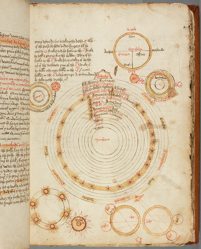 On this page (folio 17 recto), you find a world map, celestial and planetary diagrams, and diagrams of eclipses. The Huntington Library, Art Collections, and Botanical Gardens.