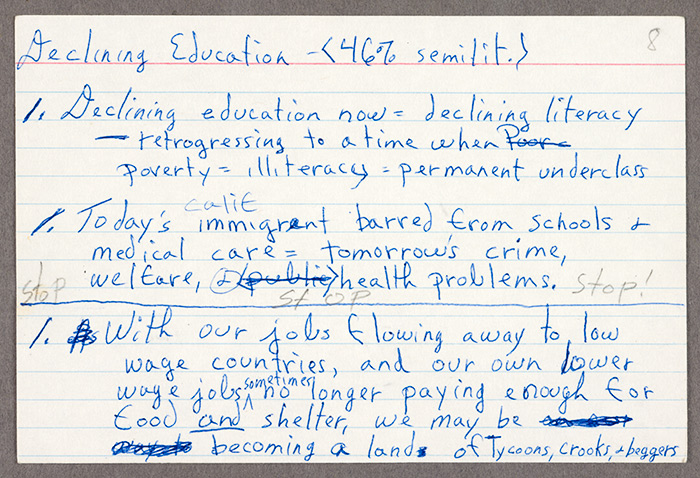 Notecard of handwritten notes by Octavia E. Butler for a speech related to her novel Parable of the Sower, ca. 1995. Octavia E. Butler papers. The Huntington Library, Art Collections, and Botanical Gardens. Copyright Estate of Octavia E. Butler.