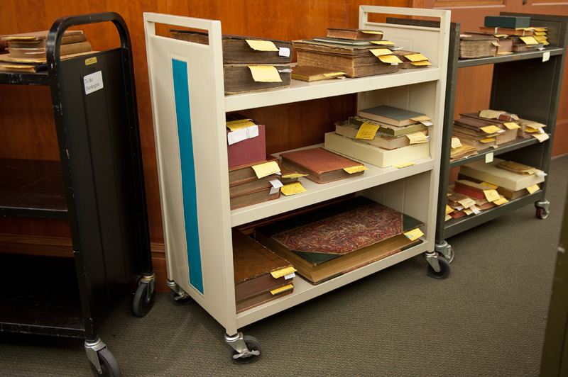 Books and manuscripts, after a full day of use by scholars, await their return to the stacks. Photo by Martha Benedict.