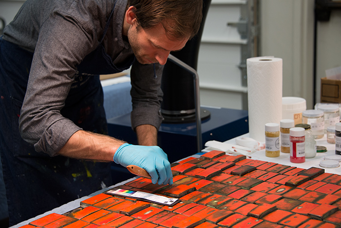 Sculptor and freelance conservator Morgan MacLean spent four months at The Huntington—documenting, treating, and installing the Doyle Lane mural in the Steven S. Koblik Education and Visitor Center. To learn more, read "Restoring a Doyle Lane Mural." Photo by Kate Lain.