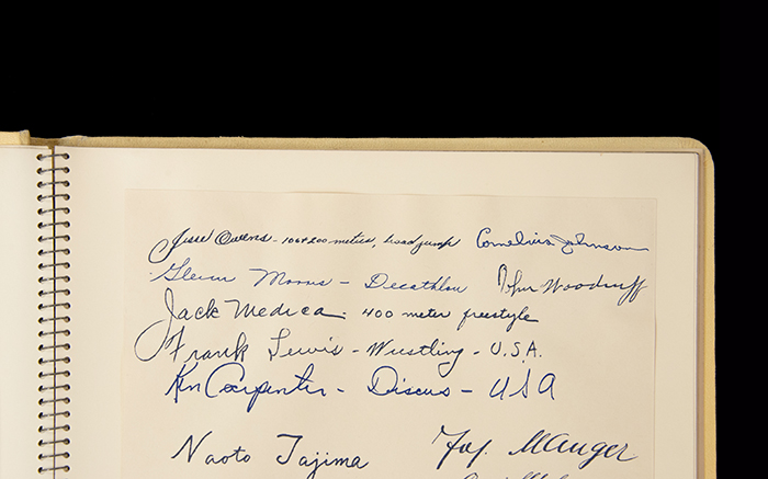 In this memory book from the XI Olympiad, Wolter collected the autographs of other athletes, including four-time track and field gold medalist Jesse Owens. Owens’ achievements are particularly notable for having dashed Nazi hopes that the Games would highlight Aryan superiority.