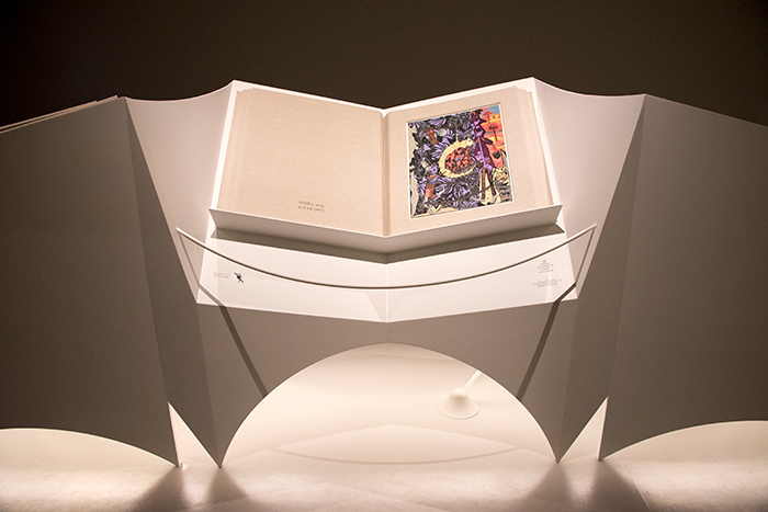A room in the Virginia Steele Scott Galleries of American Art has been transformed by the installation of six oversized books, illustrated with 65 new paintings that display Pittman’s brilliant draftsmanship and acidic color. Pittman pairs the paintings with enigmatic titles, literary references, and cultural and historical artifacts that relate an intricate and emotional narrative.