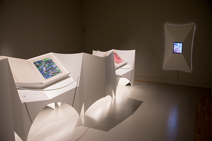 Pages in the books will be turned periodically during the run of the show. A touch screen makes it possible to view all of the paintings and text in sequential order. Photo by Kate Lain.