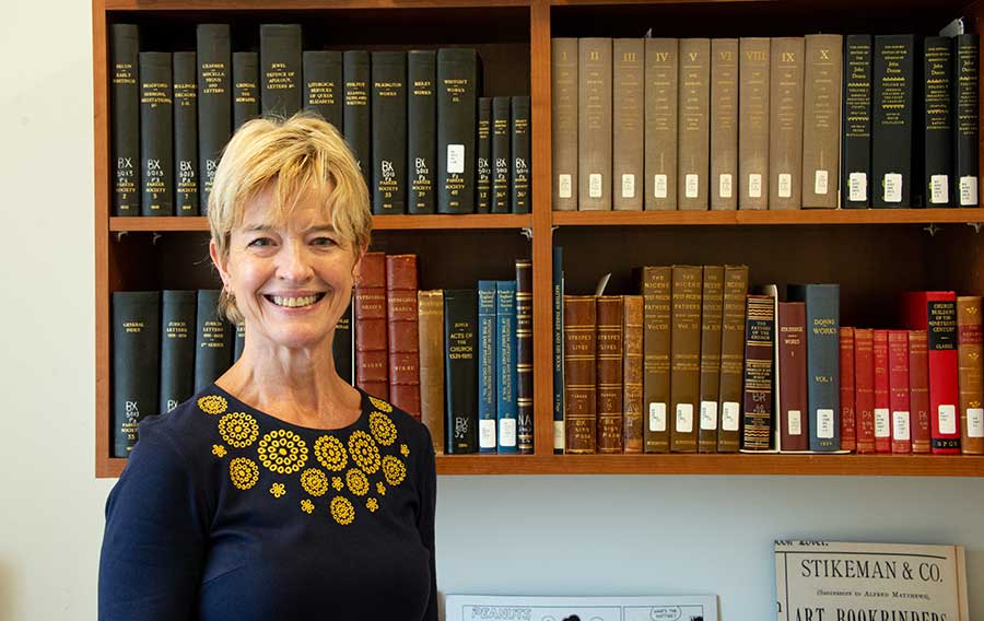 Ferrell in the office she used during her 2018–19 fellowship year at The Huntington. Behind her are volumes from the Library’s stacks that were essential for her research. Photo by Deborah Miller.