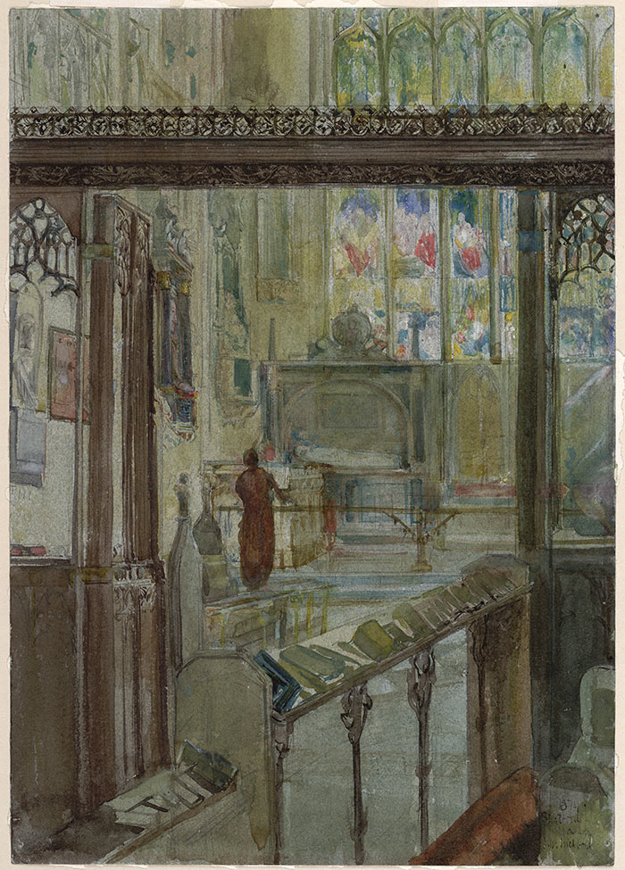 Shakespeare’s Tomb, an 1874 watercolor over pencil drawing by English painter John Inchbold (1830–1888), shows the Holy Trinity Church, where Shakespeare is buried, in Stratford-upon-Avon, Warwickshire, United Kingdom. The Huntington Library, Art Collections, and Botanical Gardens.