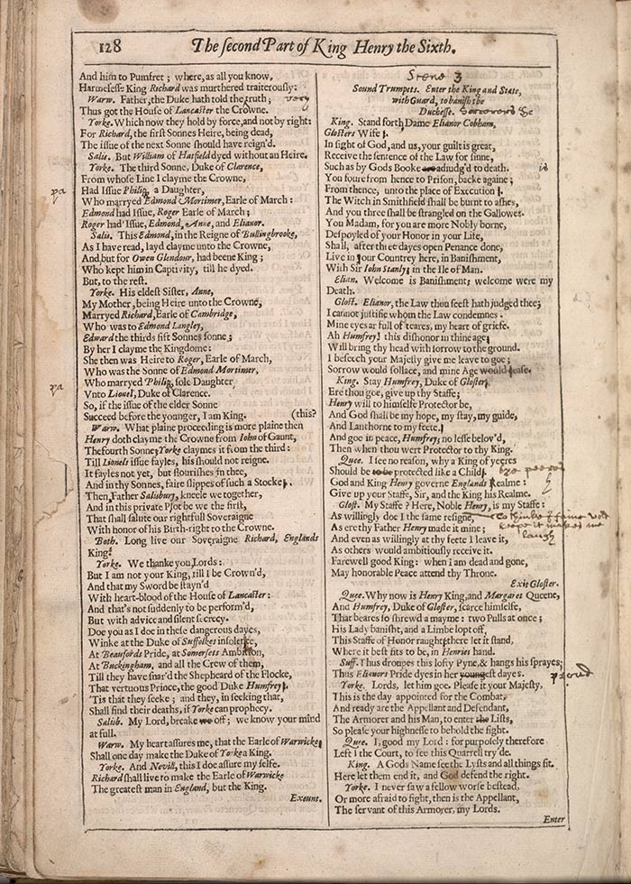 This page from Henry VI, Part 2, comes from The Huntington’s copy of the Second Folio, published in 1632. The Huntington Library, Art Collections, and Botanical Gardens.