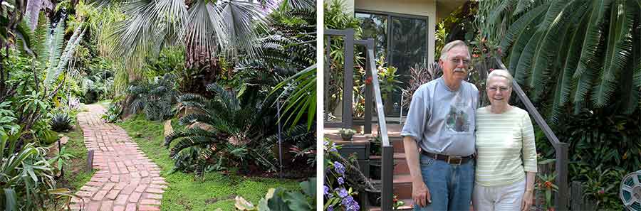 Left: Cycads lining a brick walk in Loran Whitelock’s home garden in 2014, shortly before The Huntington acquired his cycad collection. Photo by Kate Lain. Right: Loran Whitelock and his wife, Eva, in front of their home. Photo by Jim Folsom.