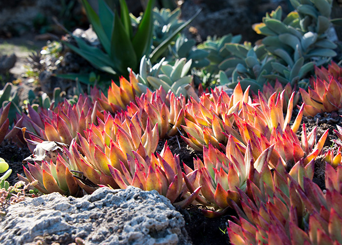 The Desert Garden is particularly vibrant in winter. Drought has concentrated the levels of anthocyanin pigment, casting a red hue in plants such as Aloe pluridens, foreground. Photo by Kate Lain.