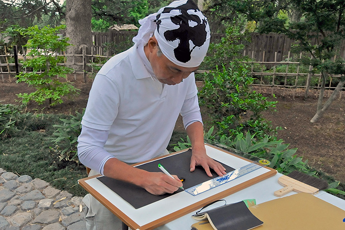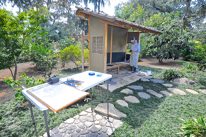 As part of periodic maintenance, the tea garden’s machiai or waiting bench received new rice paper to line its walls. Kyoto landscape designer Takuhiro Yamada consults his notes. Photo by Andrew Mitchell.