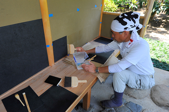 Yamada removed the faded rice paper lining the walls and cut new paper to size. He then used a Japanese raccoon bristle brush to apply a type of glue made from seaweed that has strong fixative properties but is also removable.